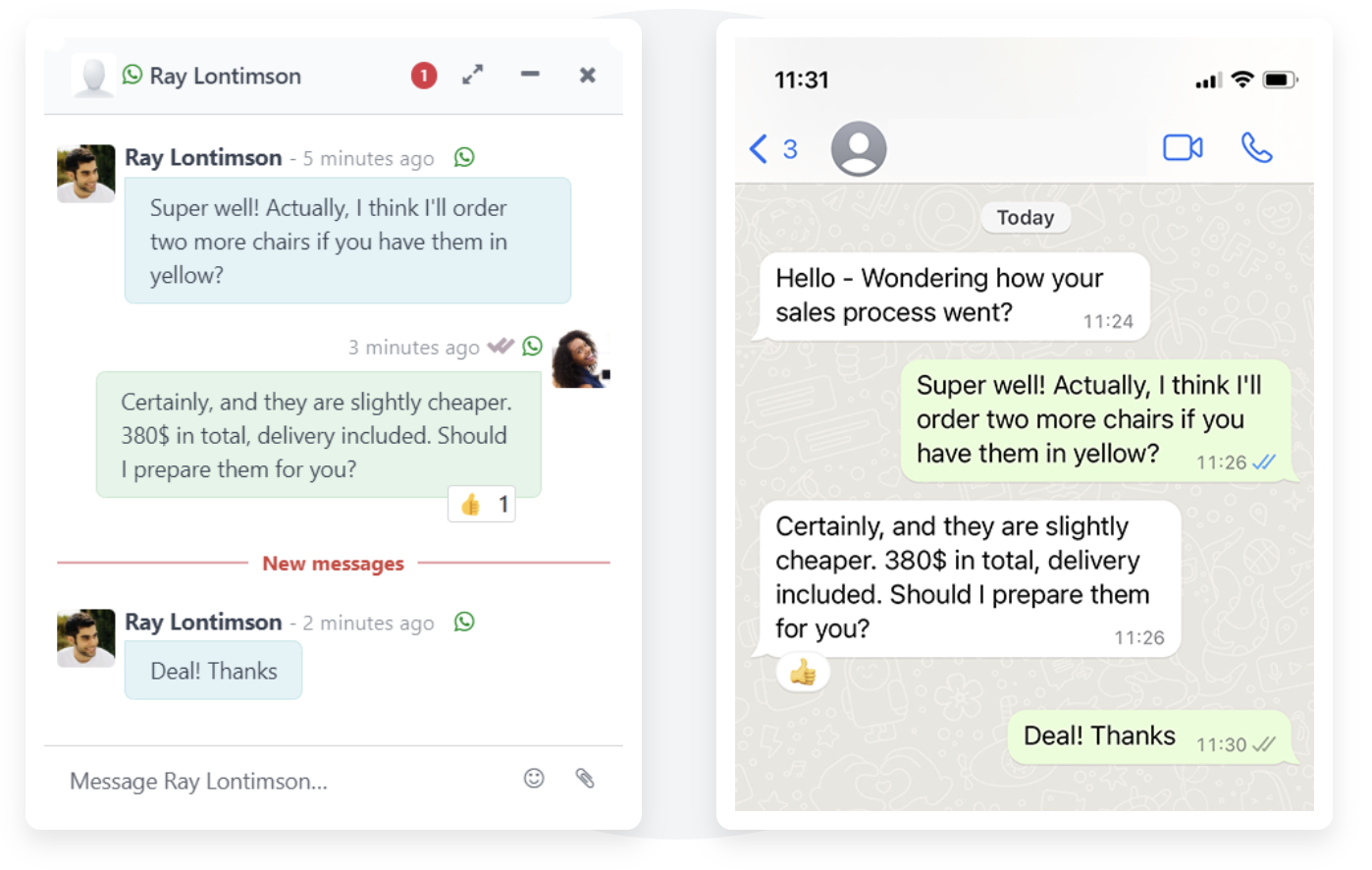 WhatsApp works side-by-side with emails, SMS, chats, video conferences, ... all while being integrated on the business documents, like quotations, invoices, events, etc.